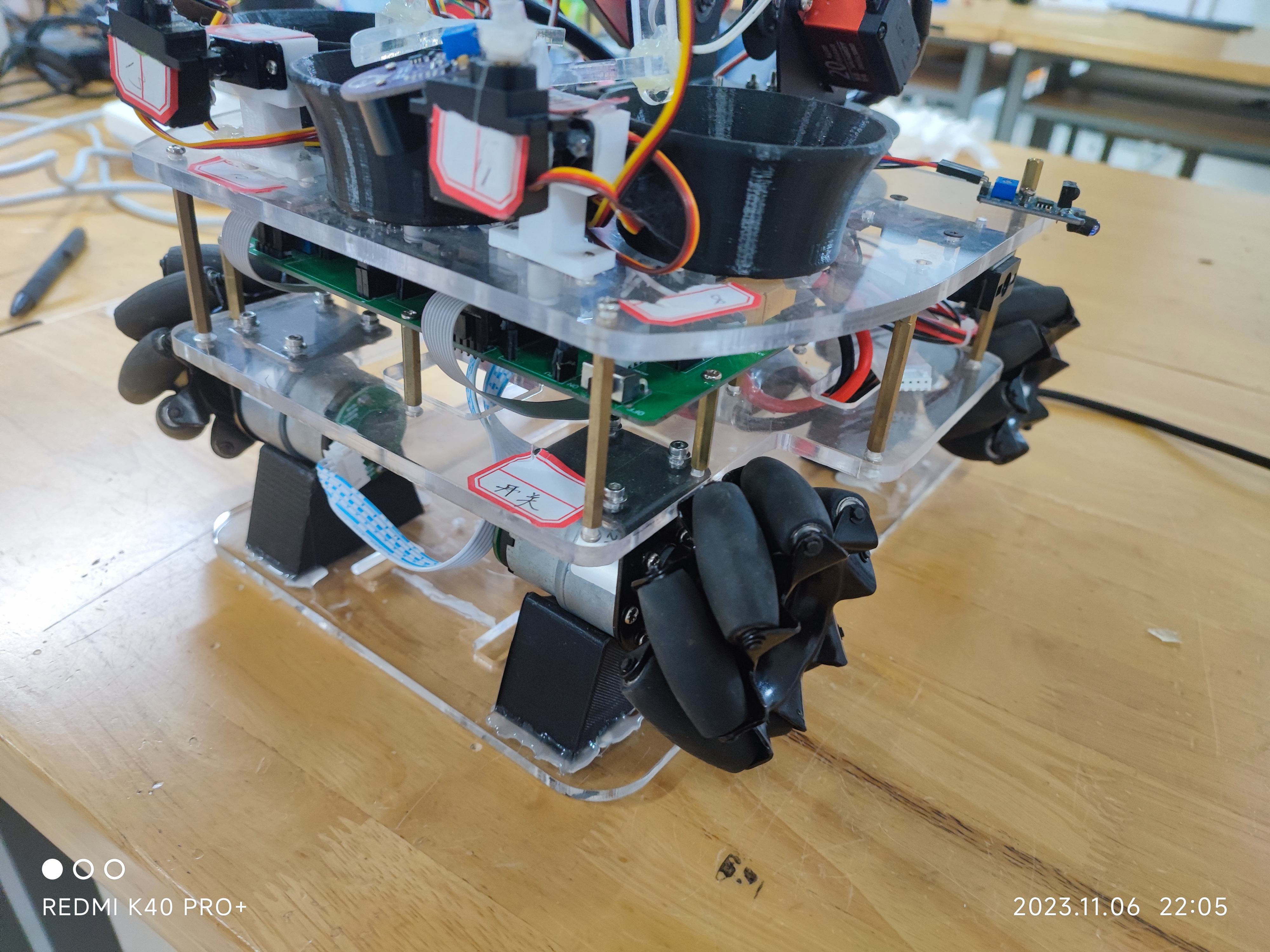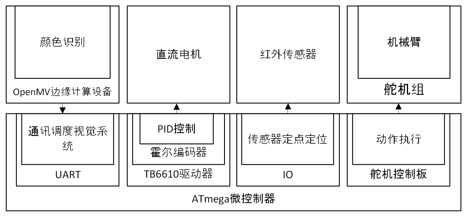 智能物流小车是利用搭载在直流电机移动平台上的机械臂与边缘计算设备,识别获取并进行拿取、码放的一种智能设备。识别方面,设备使用OpenMV作为边缘计算设备,运行基于Micropython定制的CV组件进行获取识别,随后与主控系统ATmega2560进行通讯。主控板使用ATmega2560控制器,通过调度红外边缘传感器、QR扫描器、舵机控制器、直流电机驱动器来执行动作。直流电机方面使用积分分离分段PID控制策略。