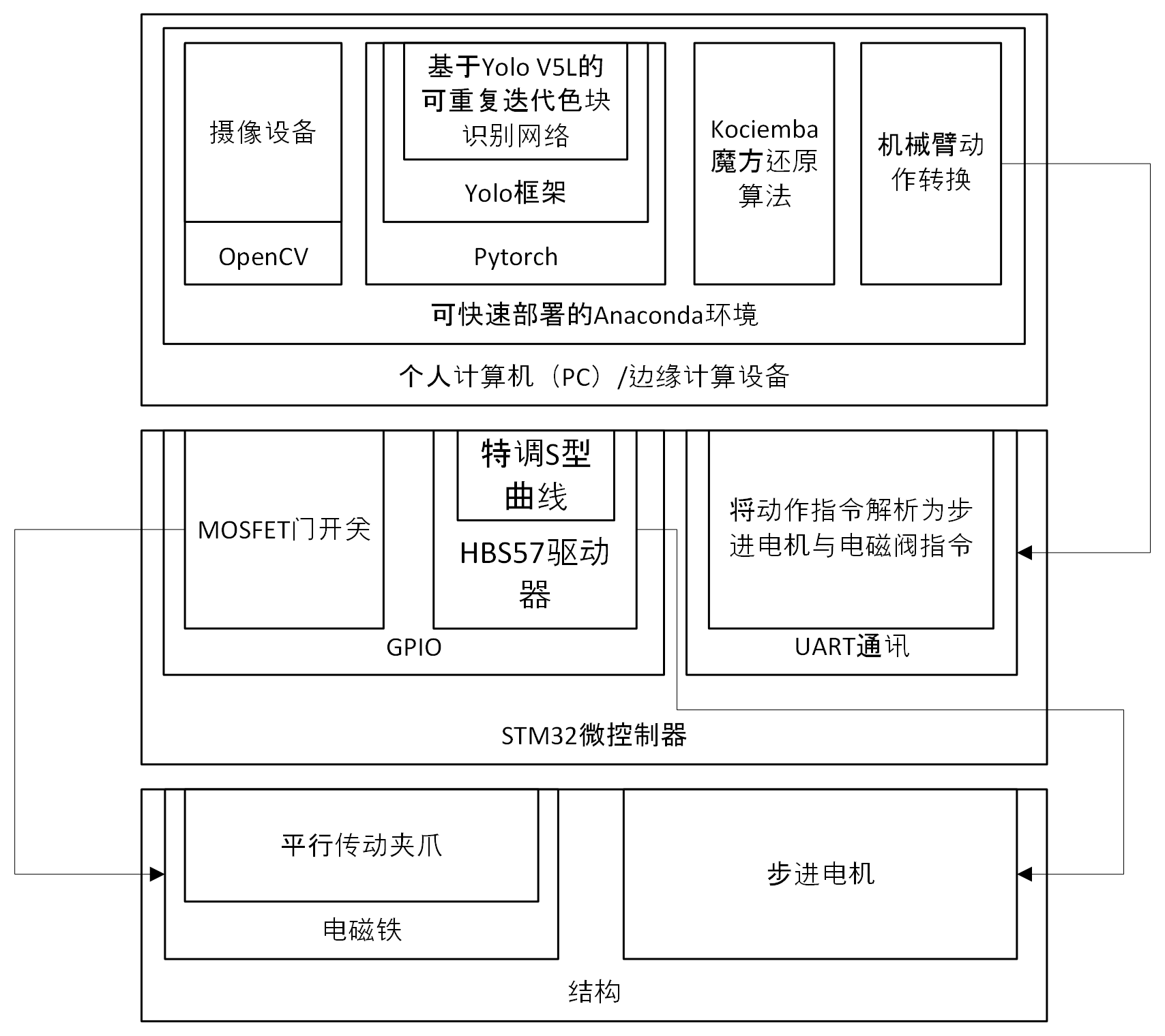 迭代视觉电磁魔方还原机是一种魔方还原机器,能够使用步进电机带动两个电磁夹爪,对魔方进行还原。视觉方面,其不使用OpenCV颜色识别,而是使用可进行迭代的Yolo V5视觉神经网络框架进行色块识别,随后将魔方序列导入解算库进行解算。步进电机使用特调S型曲线控制,保证拧动魔方时不会出现由惯性导致的分层问题。电磁夹爪采用平行四边形传动装置,使得夹爪能够纠正魔方姿态。